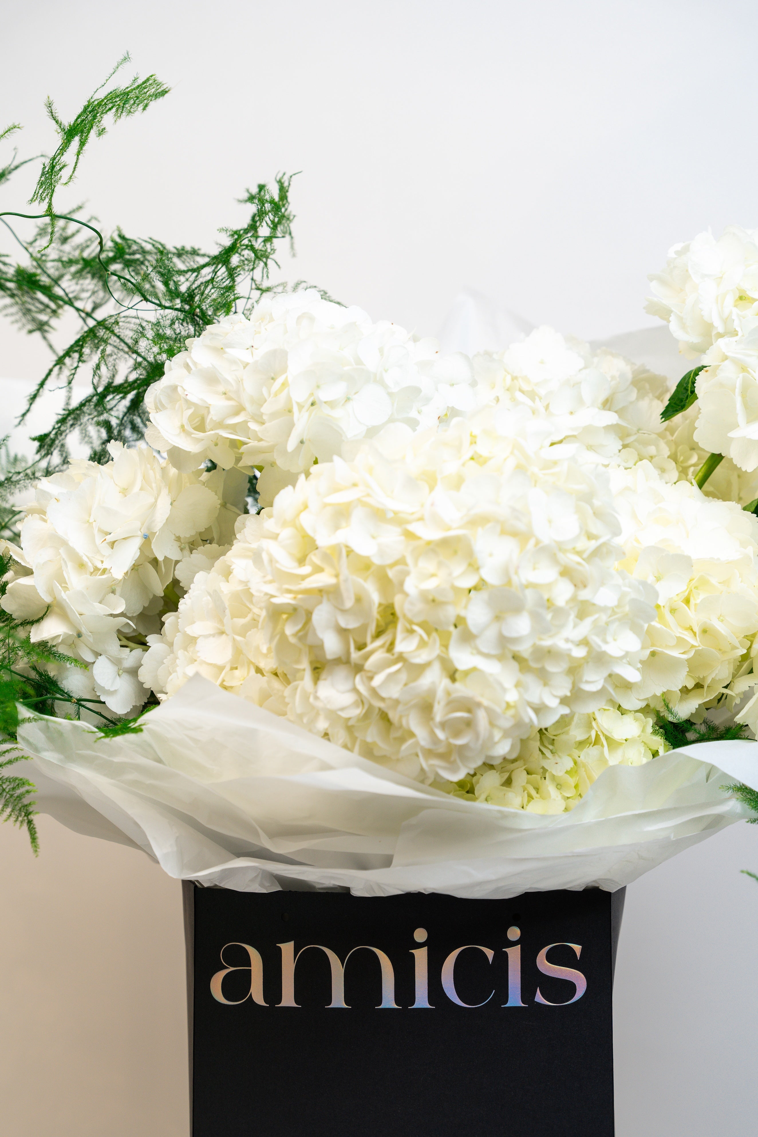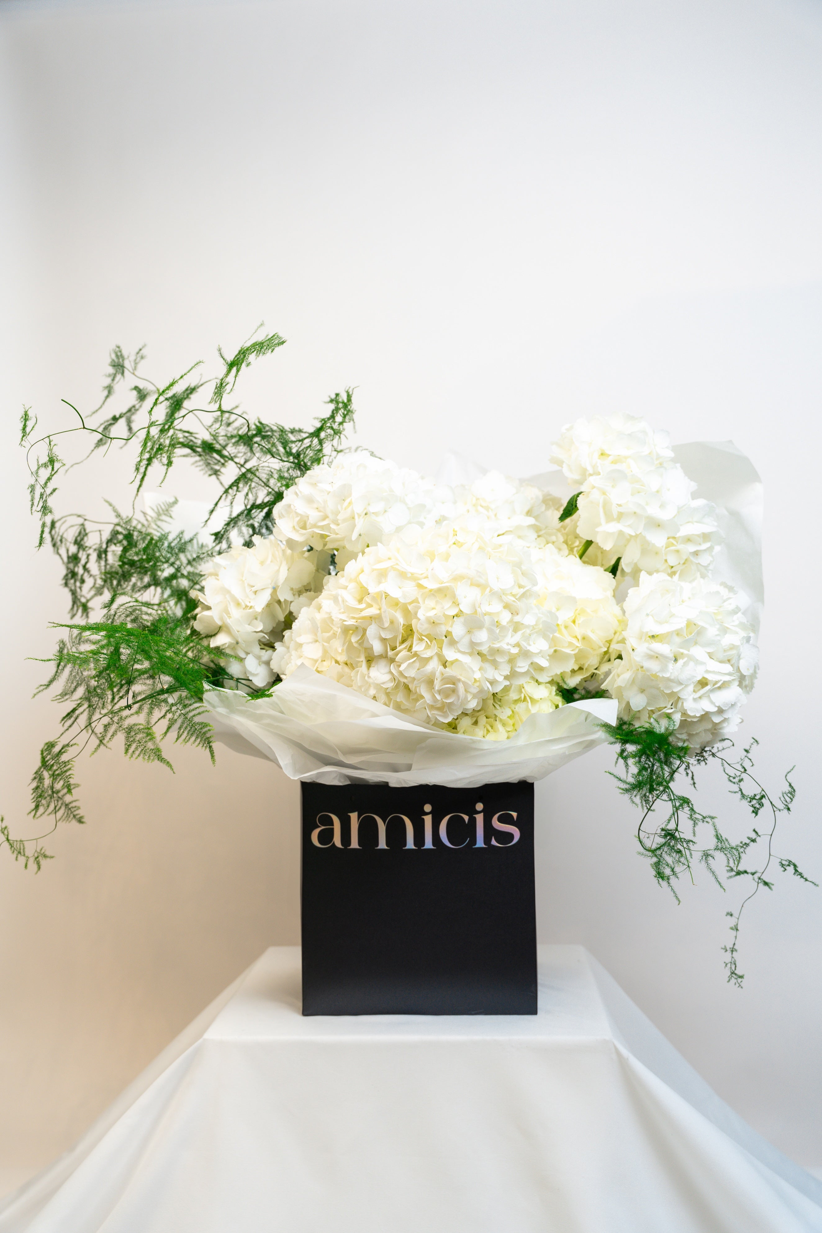 Soft whites and lush greens. Elegant simplicity: white hydrangeas and airy asparagus fern in perfect harmony.