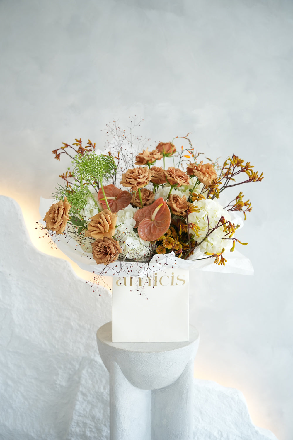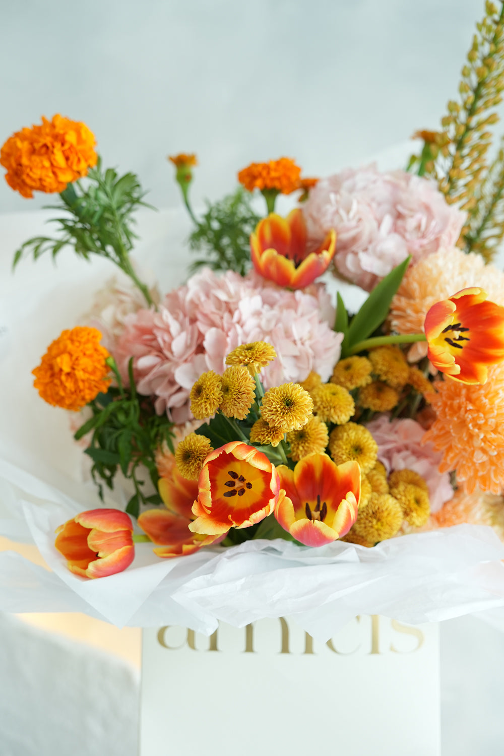 A radiant cascade of fiery tulips, golden marigolds, and soft peach blooms—Sunset Glow captures the warmth of a day’s final light. Bold, cheerful, and glowing with life, it's a bouquet that brings the magic hour to any moment.